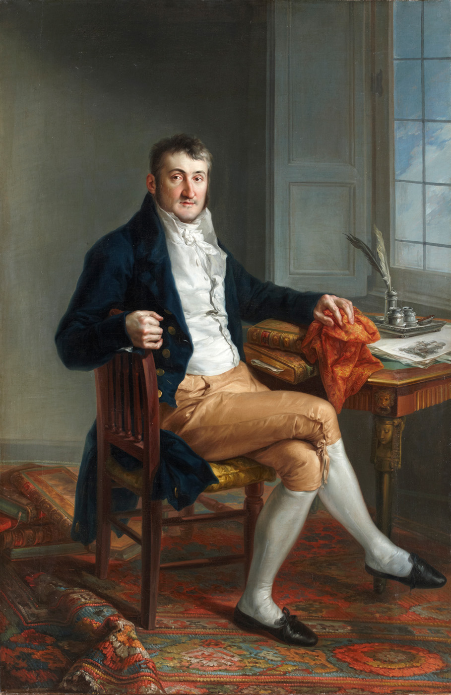 In this vertical painting, a little over 6 feet tall by 4 feet wide, a man (Richard Worsam Meade) sits at his writing desk, and turns slightly to his right to look directly at the viewer. He is seated in the corner of a room; behind him is a dark gray wall that leads to the right wall and a paned window under which the desk is positioned. The window shutters fold open to show a pale blue sky with clouds.Meade’s face is mature but smooth and unwrinkled. He has brown eyes and a small mouth, and there is a flush to his checks and prominent nose. His brown hair is cut short and extends into long, groomed sideburns. He wears a dark blue velvet coat with brass buttons over a white waistcoat and cravat. Meade sits with his right leg crossed over his left knee, displaying gold knee breeches, silvery-white silk stockings, and fitted black leather shoes. His right arm lies across the back of the chair as he grips the top corner to turn and face the viewer. His left arm rests on two books that are stacked on the writing desk: a Tratado de Comercio (Commercial Trade Agreement) and the Ordenes de Bilbao (Orders of Bilbao). In his left hand he holds an orange-patterned cloth that is draped over an unseen object. Business papers on the desk bear the image of the Pillars of Hercules, part of Spanish royal heraldry. Behind the books and papers, there is a silver tray with inkwells and quills.