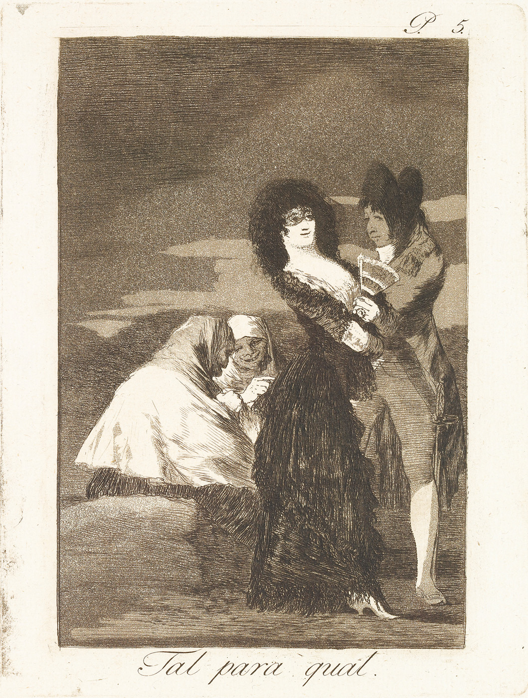 Search collection search This image is restricted, permission must be requested for reproduction. Downloading for commercial use is prohibited. If you wish to obtain rights to reproduce this image please see our Rights and Reproductions page. Francisco José de Goya y Lucientes (1746 - 1828) Two of a kind. Tal para qual. from "The Caprices (Los Caprichos)" 1799 Etching, aquatint and drypoint 11 5/8 x 8 in. (29.5 x 20.3 cm) Century: 18th Century State: First Edition Plate/Negative Date: c. 1797 - 98 Credit Line: Meadows Museum, SMU, Dallas. Algur H. Meadows Collection, MM.67.06.05 Accession Number: MM.67.06.05 Tweet More Information Submit comments about this object Also found in… Francisco José de GOYA y Lucientes Works on Paper first previous next last record 6 of 81 , "Quick Search has caprichos" Michael Bodycomb 02/25/2026 Bookmark: https://meadowsmuseumdallas.org/collections/pages/objects-1/info/832