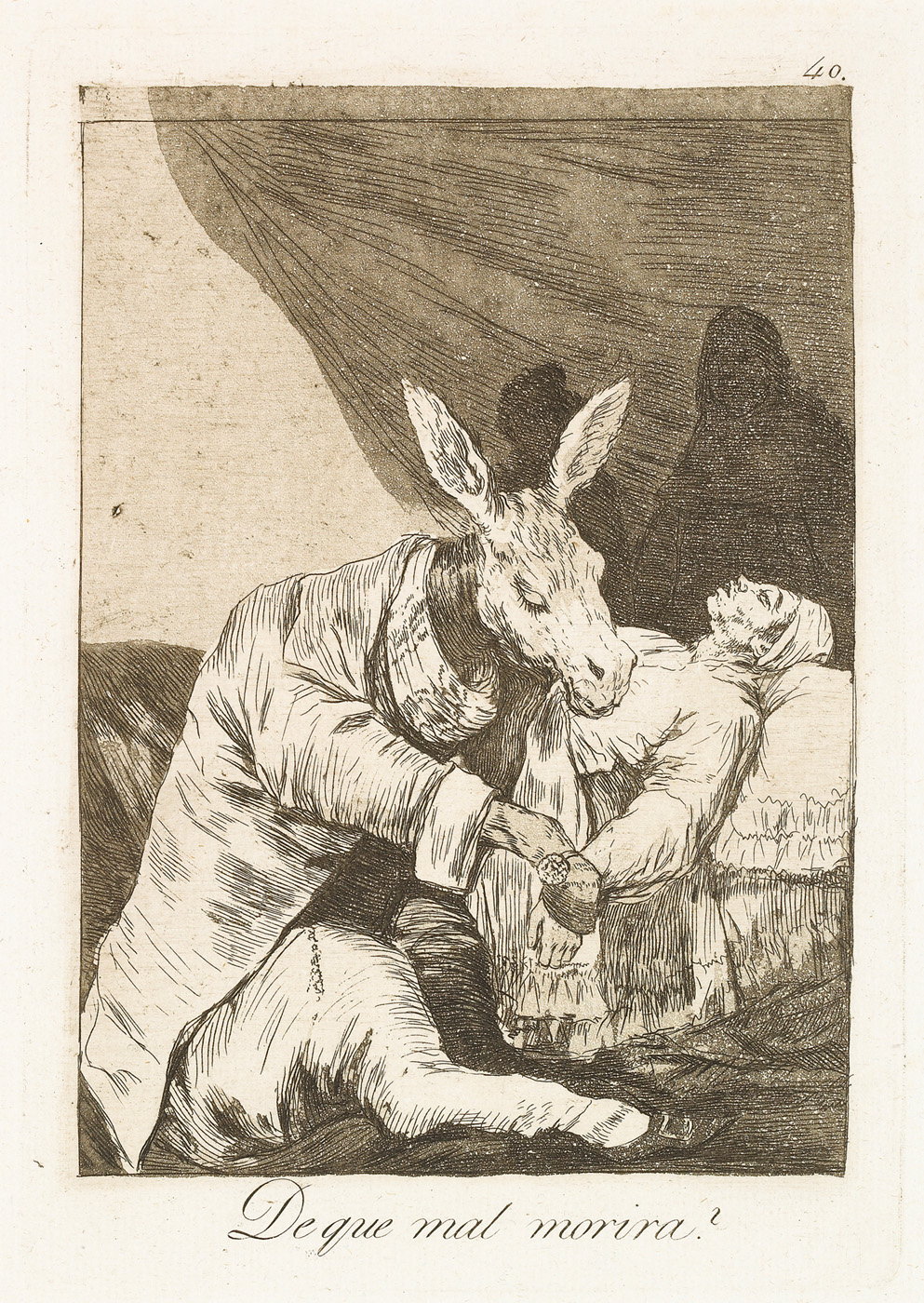 Search collection search This image is restricted, permission must be requested for reproduction. Downloading for commercial use is prohibited. If you wish to obtain rights to reproduce this image please see our Rights and Reproductions page. Francisco José de Goya y Lucientes (1746 - 1828) Of what ill will he die? De que mal morira? from "The Caprices (Los Caprichos)" 1799 Etching and aquatint 11 5/8 x 8 in. (29.5 x 20.3 cm) Century: 18th Century State: First Edition Plate/Negative Date: c. 1797 - 98 Credit Line: Meadows Museum, SMU, Dallas. Algur H. Meadows Collection, MM.67.06.40 Accession Number: MM.67.06.40 Tweet More Information Submit comments about this object Also found in… Francisco José de GOYA y Lucientes Works on Paper first previous next last record 59 of 243 , "Related to "Francisco José de Goya y Lucientes"" Michael Bodycomb 02/24/2026 Bookmark: https://meadowsmuseumdallas.org/collections/pages/objects-1/info/867