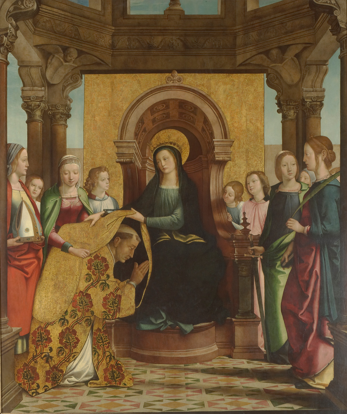 The scene takes place in an architectural setting that opens to the outdoors. Stone columns with elaborate capitals support an octagonal roof over the group of figures, which all stand on a floor tiled with geometric patterns. The blue sky of the background appears between the columns and through an opening in the roof. The architectural elements employ geometric perspective, giving the illusion of spatial recession.