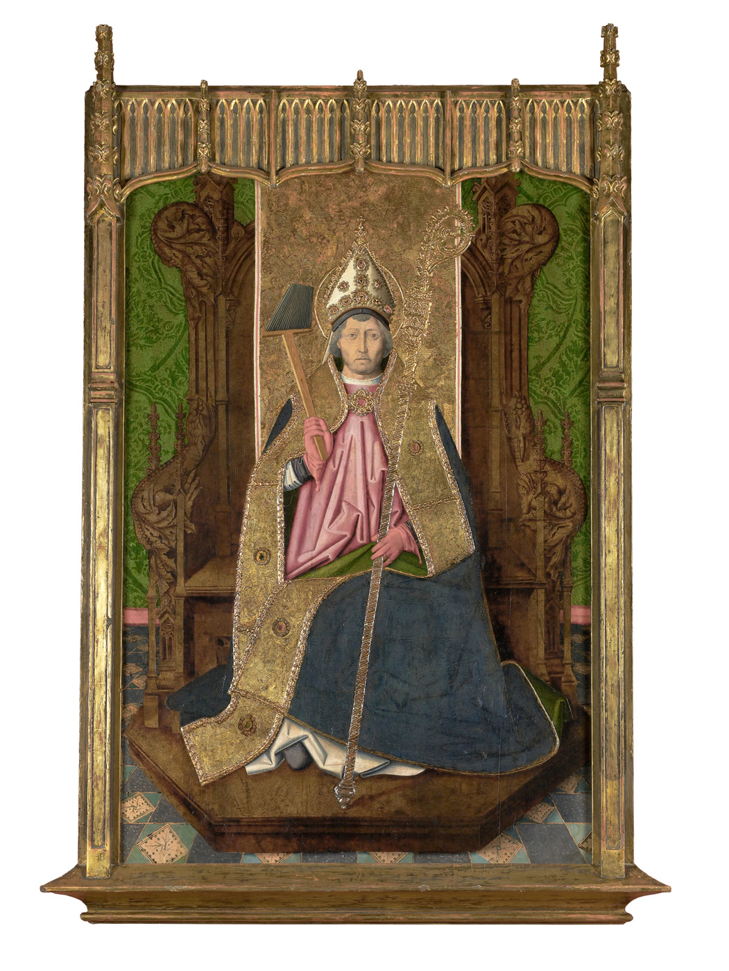 He wears pink gloves and in his right hand he holds up a wool carder’s comb. In his left, he holds a long gilded crosier (ceremonial staff) that extends from the base of the throne toward the top right of the panel. A pattern of green, yellow, and gray squares decorate the floor and behind the throne is a patterned dark green wall.