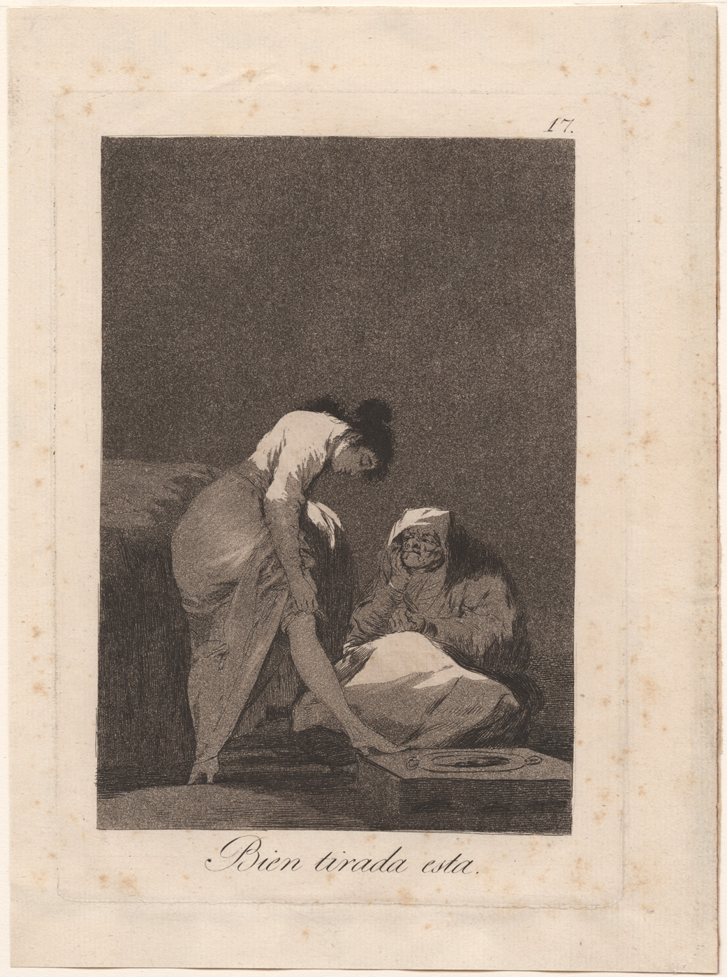 Search collection search This image is restricted, permission must be requested for reproduction. Downloading for commercial use is prohibited. If you wish to obtain rights to reproduce this image please see our Rights and Reproductions page. Francisco José de Goya y Lucientes (1746 - 1828) It is nicely stretched. (Bien tirada está.) Bien tirada está. from "The Caprices (Los Caprichos)" c. 1799 Etching, burnished aquatint and burin on paper 10 3/8 x 7 1/2 in. (26.4 x 19.1 cm) Century: 18th Century State: trial proof of plate 17 Plate/Negative Date: c. 1797 - 98 Credit Line: Meadows Museum, SMU, Dallas. Museum purchase, The Meadows Foundation Fund, MM.06.01 Accession Number: MM.06.01 Tweet More Information Submit comments about this object Also found in… Francisco José de GOYA y Lucientes Works on Paper first previous next last record 1 of 81 , "Quick Search has caprichos" 12/17/2025 Bookmark: https://meadowsmuseumdallas.org/collections/pages/objects-1/info/815